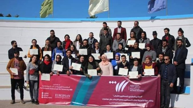 نظم المنتدى المغربي للصحفيين الشباب بشراكة مع المؤسسة الاوروبية من اجل الديمقراطية دورة تكوينية لفائدة 40 صحفي وصحفية من مختلف المنابر الاعلامية الوطنية والجهوية ، وذلك يومي 9 و 10 فبراير 2019 بالمركب الدولي للطفولة والشباب مولاي رشيد ببوزنيقة.