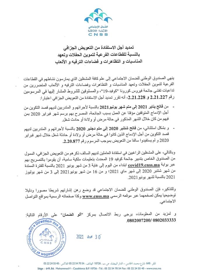 وبالتالي، يضيف الصندوق، على المشغلين الراغبين في استفادة العاملين لديهم السالف ذكرهم من التعويض الجزافي، الممول من الصندوق الخاص بتدبير جائحة كوفيد 19 المحدث بتعليمات ملكية سامية، أن يقوموا بالتصريح بهم عبر بوابة covid19.cnss.ma ابتداء من اليوم وإلى غاية 3 من شهر يونيو 2021 بالنسبة للفترة الممتدة من شهر شتنبر 2020 إلى شهر ماي 2021، و من 16 من شهر يونيو 2021 إلى 3 من شهر يوليوز 2021 بالنسبة لشهر يونيو 2021.