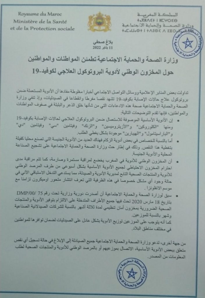 • أن المخزون الوطني للأدوية في المغرب يخضع لمراقبة مستمرة وصارمة، كما تتم مراقبة مدى احترام المخزون الاحتياطي لجميع الأدوية الأساسية بشكل أسبوعي من طرف المرصد الوطني للأدوية والمنتجات الصحية التابع لمديرية الأدوية والصيدلة، مما يستدعي التدخل الاستباقي الآني في حالة وجود أي مشكل خصوصا في هذه الظرفية التي تعرف انتشار متحور اوميكرون تزامنا مع موسم الانفلونزا.