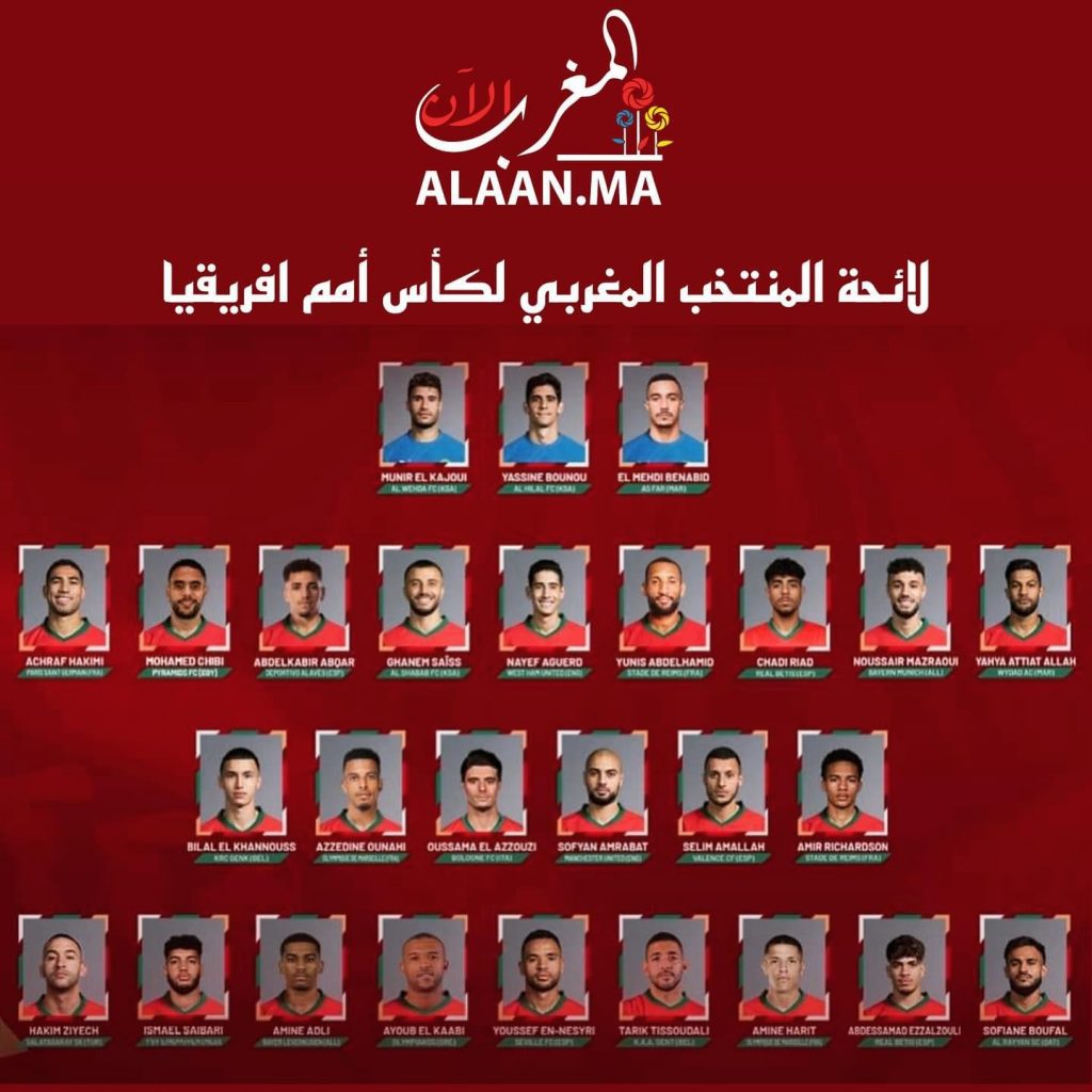 كشف الناخب الوطني المغربي لكرة القدم وليد الركراكي، الخميس 28 دجنبر 2023، لائحة اللاعبين النهائية المكونة من 27 لاعبا، التي اختارها للمشاركة في نهائيات كأس أمم إفريقيا، المرتقب إجراؤها بالكوت ديفوار في الفترة الممتدة ما بين الـ13 يناير و11 فبراير 2024 .