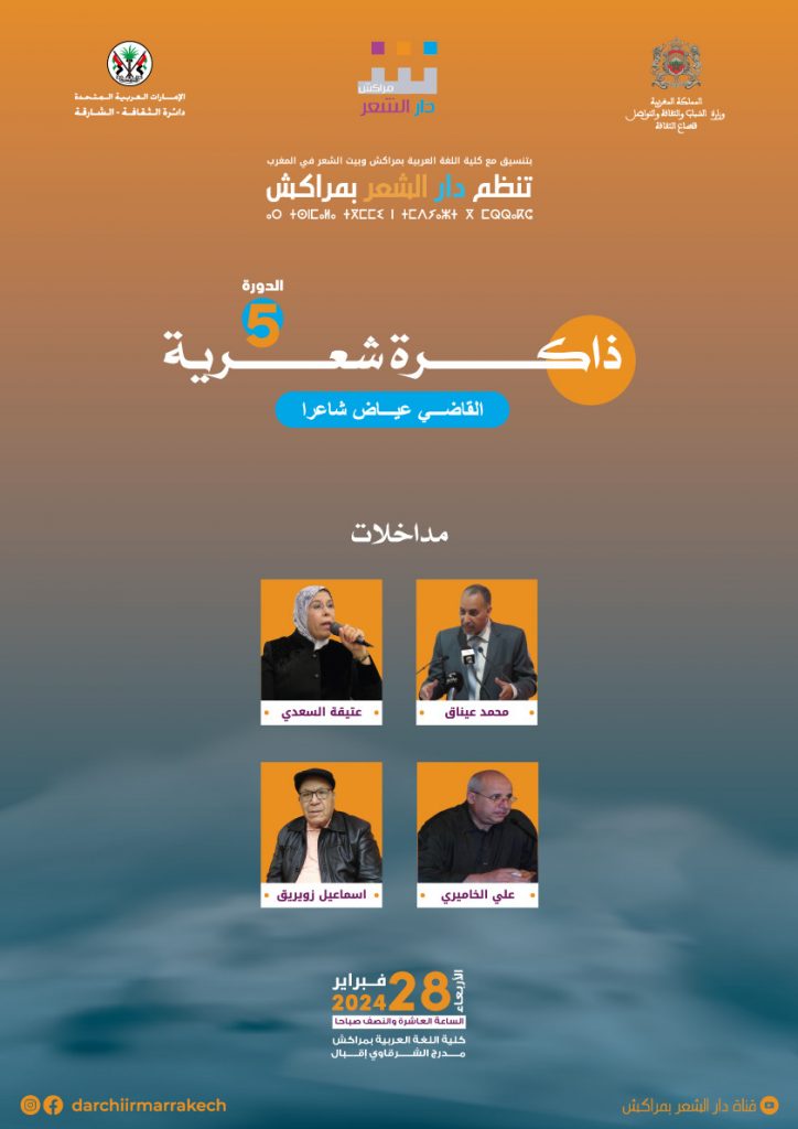تنظم دار الشعر بمراكش، بتنسيق مع كلية اللغة العربية وبيت الشعر في المغرب، الدورة الخامسة لفعاليات الندوة الوطنية “ذاكرة شعرية”: ندوة “القاضي عياض شاعرا“، وذلك يوم الأربعاء 28 فبراير 2024 على الساعة العاشرة والنصف صباحا بمدرج أحمد الشرقاوي إقبال، بفضاء كلية اللغة العربية بمراكش. ويشارك في هذا اللقاء العلمي ثلة من الأساتذة والباحثين والشعراء، الباحث الدكتور محمد عيناق والباحثة الدكتورة عتيقة السعدي والباحث الدكتور علي الخاميري والشاعر اسماعيل زويريق والذي أنهى مؤخرا، نظم “كتاب الشفا للقاضي عياض” بستة آلاف بيت.