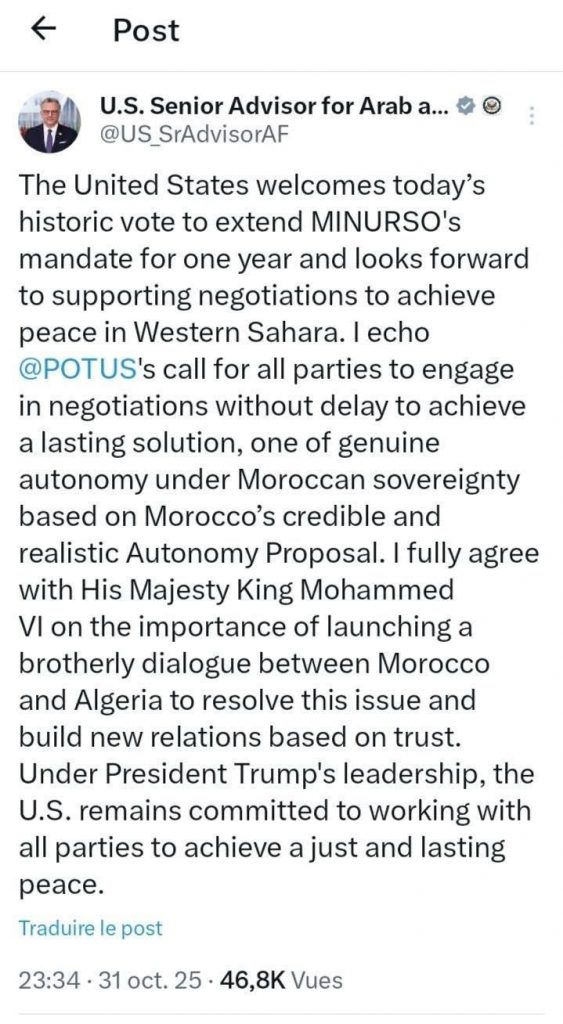 وأعاد بولس في تغريدة له على صفحته الشخصية بمنصة “X” التذكير بـ”دعوة الرئيس دونالد ترامب جميع الأطراف إلى الانخراط في المفاوضات بدون تأخير من أجل التوصل إلى حل دائم، يقوم على حكم ذاتي حقيقي تحت السيادة المغربية؛ استنادا إلى المقترح المغربي المعتمد والواقعي للحكم الذاتي”.