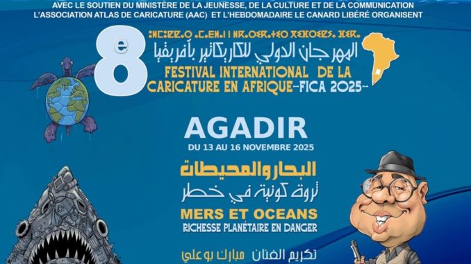 تستعد مدينة أكادير لاحتضان فعاليات الدورة الثامنة للمهرجان الدولي للكاريكاتير بإفريقيا (فيكا)، التي تُقام بدعم من وزارة الشباب والثقافة والتواصل، وتنظمها جمعية أطلس للكاريكاتير (AAC) والأسبوعية “لوكنار ليبيري”، وذلك في الفترة الممتدة من 13 إلى 16 نوفمبرالجاري.