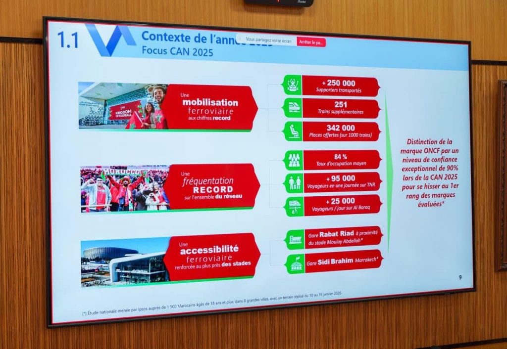 وبالموازاة مع ذلك، أكد المكتب الوطني للسكك الحديدية مرة أخرى تفوقه الميداني من خلال وضع منظومة خاصة لمواكبة كأس أمم إفريقيا. إذ ساهم افتتاح محطة الرباط الرياض، وبرمجة توقفات استثنائية بمحطة سيدي إبراهيم بمراكش، وتعبئة أكثر من 250 قطارا إضافيا، في نقل أكثر من 250 ألف مشجع بين المدن المستضيفة.