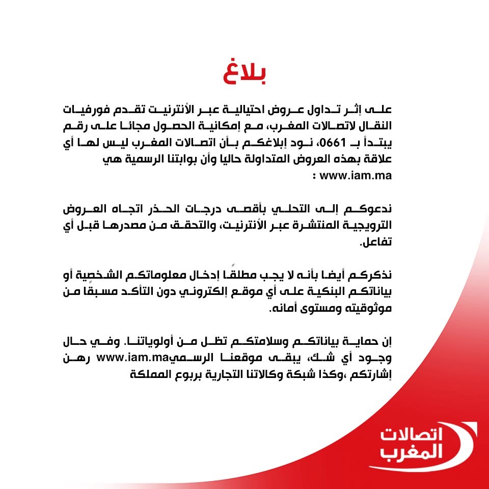 وأوضحت الشركة أن بوابتها الرسمية الوحيدة هي الموقع الإلكتروني (www.iam.ma)، داعية إلى ضرورة التحقق من مصدر أي عرض ترويجي قبل التفاعل معه، خاصة في ظل تزايد محاولات النصب الإلكتروني.