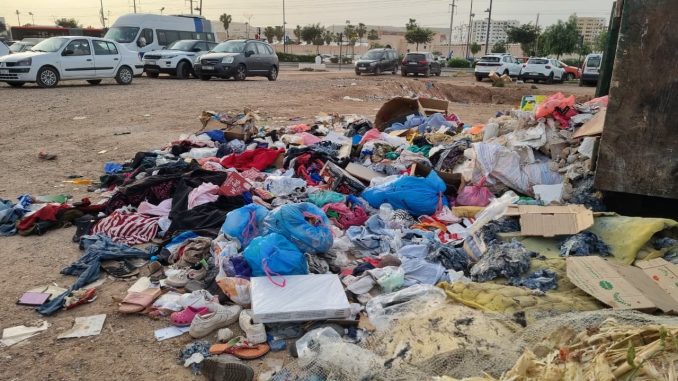 وكشفت المعاينات الميدانية، كما توثقها الصور، عن انتشار أكوام من الملابس المستعملة والأكياس البلاستيكية ومخلفات مختلفة تم التخلص منها بشكل عشوائي بالقرب من الفضاء التجاري وأمام سوق سيدي يوسف، في ظل غياب واضح لعمليات جمع منتظمة أو رقابة فعالة. ولا يؤثر هذا الوضع فقط على جمالية المكان، بل يشكل أيضًا تهديدًا بيئيًا وصحيًا، خاصة مع ارتفاع درجات الحرارة التي تسرّع من تحلل النفايات وتفاقم انتشار الحشرات.