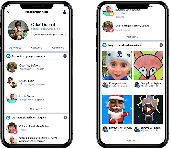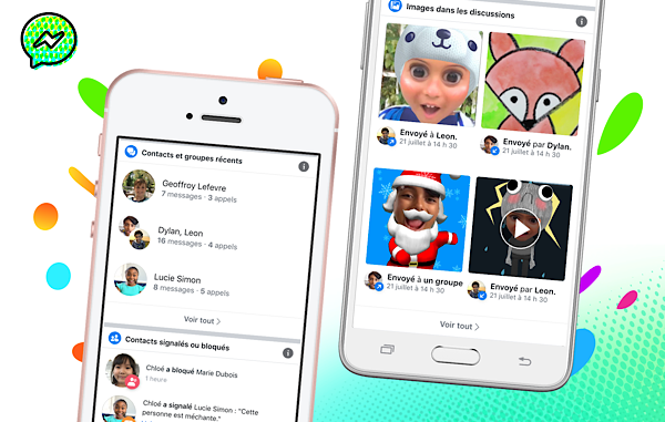 ● مراقبة المحادثات التي تمت مؤخرًا، سرد تاريخي للمحادثة، جهات الاتصال المحظورة أو المبلّغ عنها: يمكن لولي الأمر معرفة مع من يتحدث طفله، وسواء كانت محادثة مرئية أم مراسلة نصية، وتكرار المحادثة خلال الثلاثين يومًا الماضية. كما يمكن لولي الأمر أيضًا الإطلاع على قائمة بجهات الاتصال التي حظرها الطفل و / أو ألغى حظرها، وإذا ما أبلغ عن أي رسائل، بالإضافة إلى أي جهات اتصال أبلغ عنها وسبب تصرفه. وسيستمر إبلاغ ولي الأمر عبر تطبيق مسنجر إذا قام طفلهم بحظر أو الإبلاغ عن أحدهم.